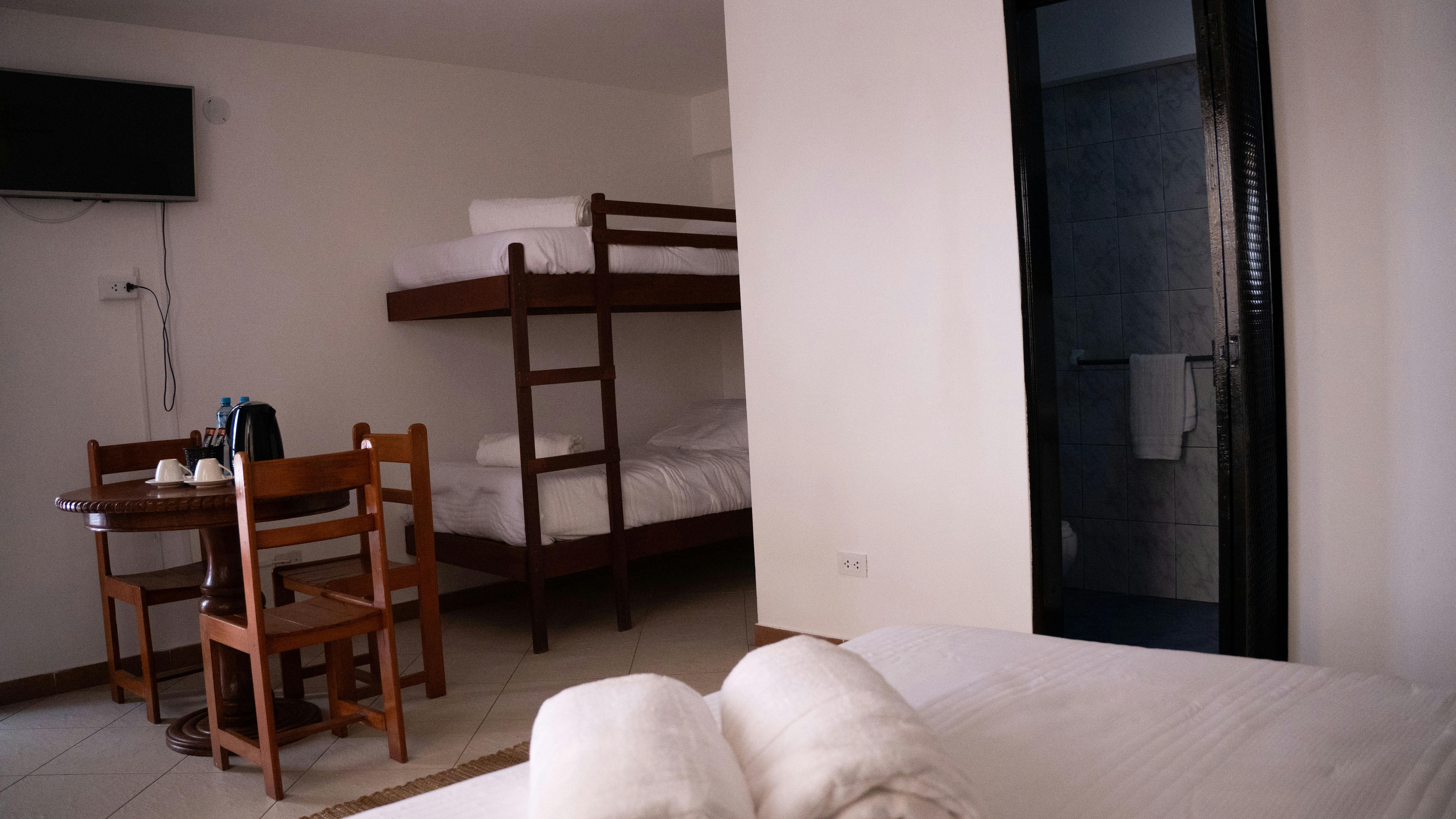 Our quadruple room has a double bed plus bunk beds, breakfast table, bathroom with shower and hot water, SMART TV 32”, Wi-fi and pool view.
